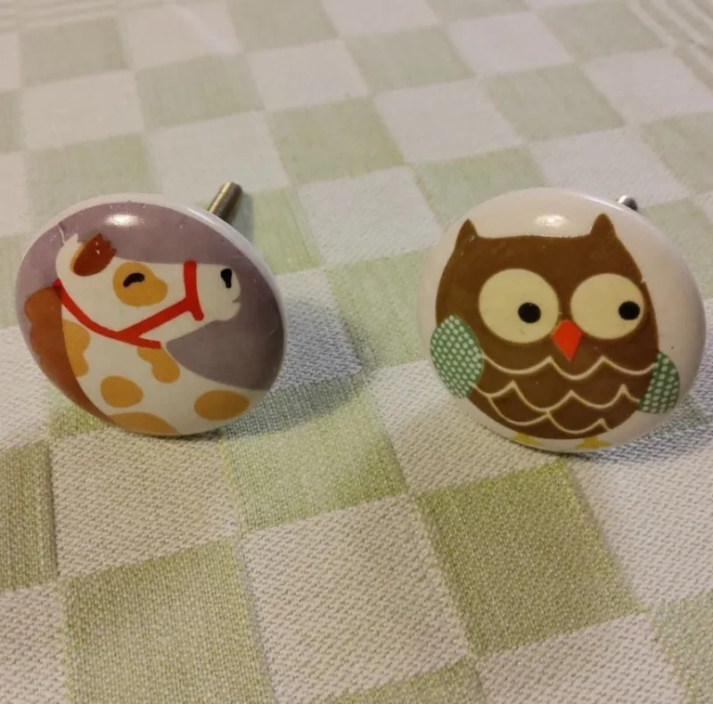 Säljer två söta keramik knoppar med djurmotiv, häst och uggla. Perfekta för barnrummet eller andra möbler där du vill ha en personlig touch. Ca 4 cm i diameter.