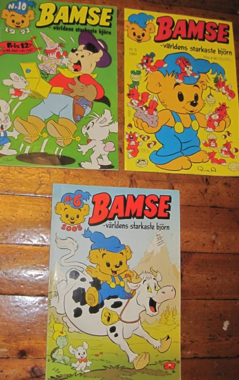 3 st. Serietidningar: "Bamse-världens starkaste björn" Nr 5-1981, nr 10-1992 och nr 6-2005, Kärnan Egmont. Tidningarna är i fint skick och varsamt bläddrade i!