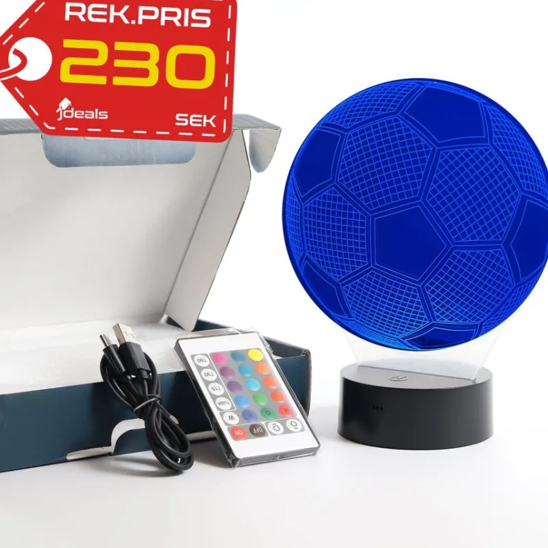 En 3D effekt nattlampa med fotbollstema som kombinerar kreativ design och praktisk funktion! Denna bordslampa skapar en tredimensionell illusion och passar perfekt som dekoration i sovrum, barnrum eller vardagsrum. Med sin 16-färgs LED-ljus och fjärrkontroll kan du enkelt justera ljusstyrka och färger för att skapa rätt atmosfär. En fantastisk presentidé för födelsedagar, fotbollsfans och barn som älskar spännande belysning!