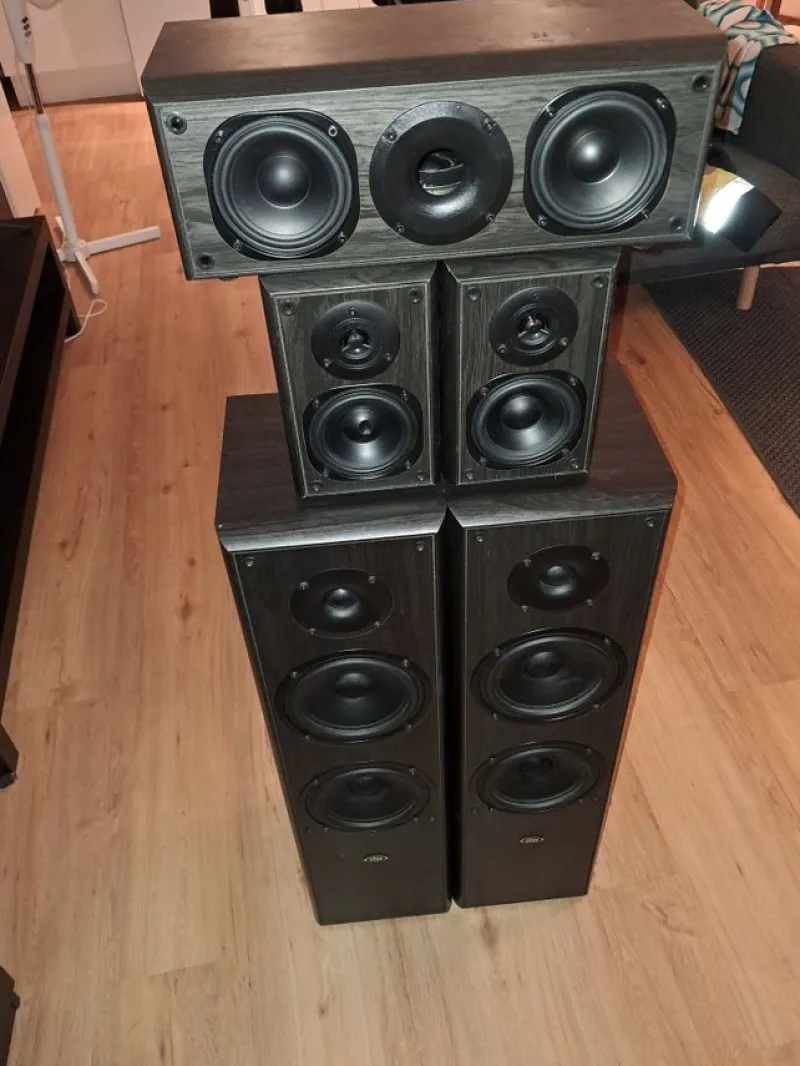 Högtalarsystem 5.1. Systemet inkluderar två stora golvhögtalare, två mindre surroundhögtalare och en centerhögtalare säljes i befintligt skick