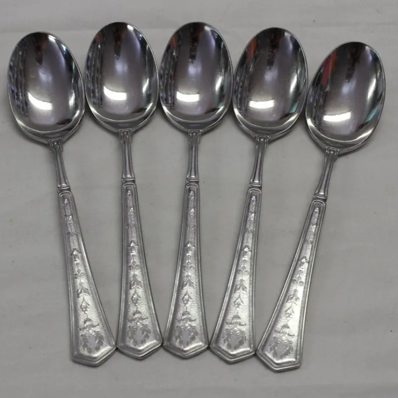 5 Bordsked Bordskedar Sked Skedar 18,6 cm i Rostfritt med Dekor som Liknar Silverbestick Dekor i mycket gott begagnat skick (Kolla noga på bilder ).