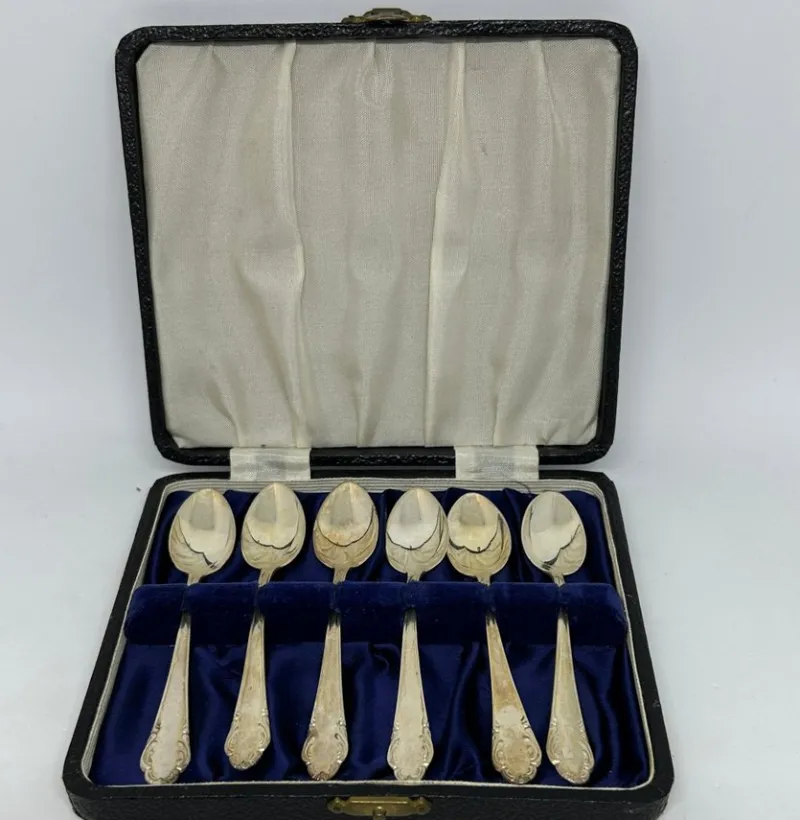 6 kaffeskedar modell "Haga", svenskt silver, i elegant läderetui.