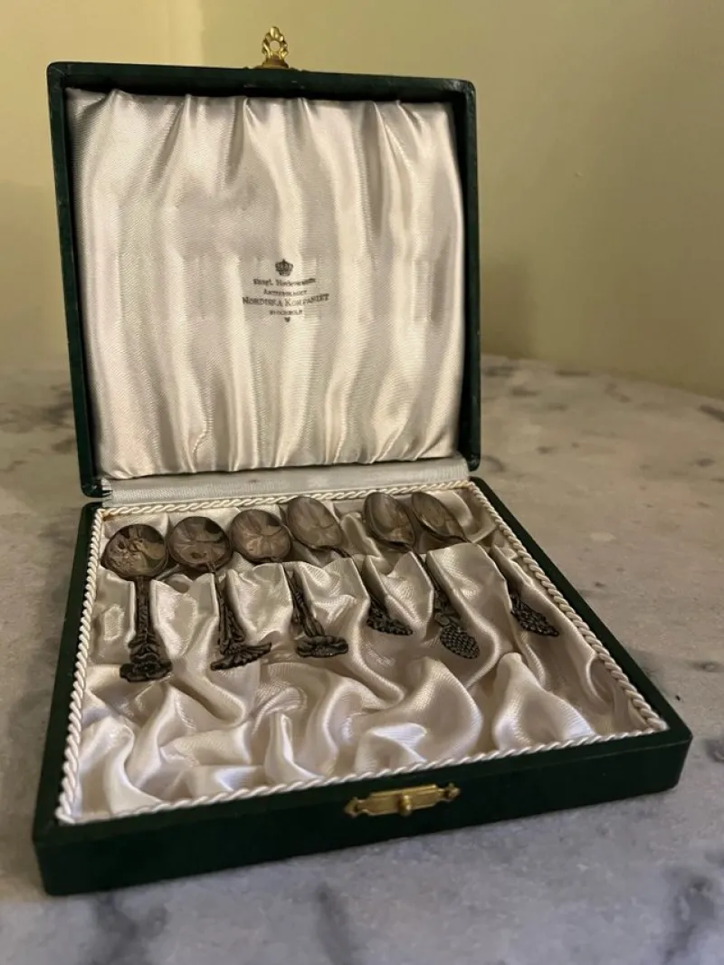 Tradera 6 st silverskedar i etui – Kungl Hovleverantör Nordiska Kompaniet jugend silver> Silver