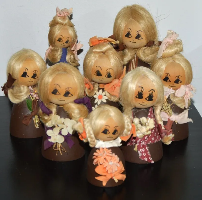 Välkommen till min auktion som gäller åtta handgjorda trädockor, designade av Barbro Landström, 70-tal. Dockorna är mönsterskyddade. De är i fint begagnat skick, se bilder för egen bedömning.