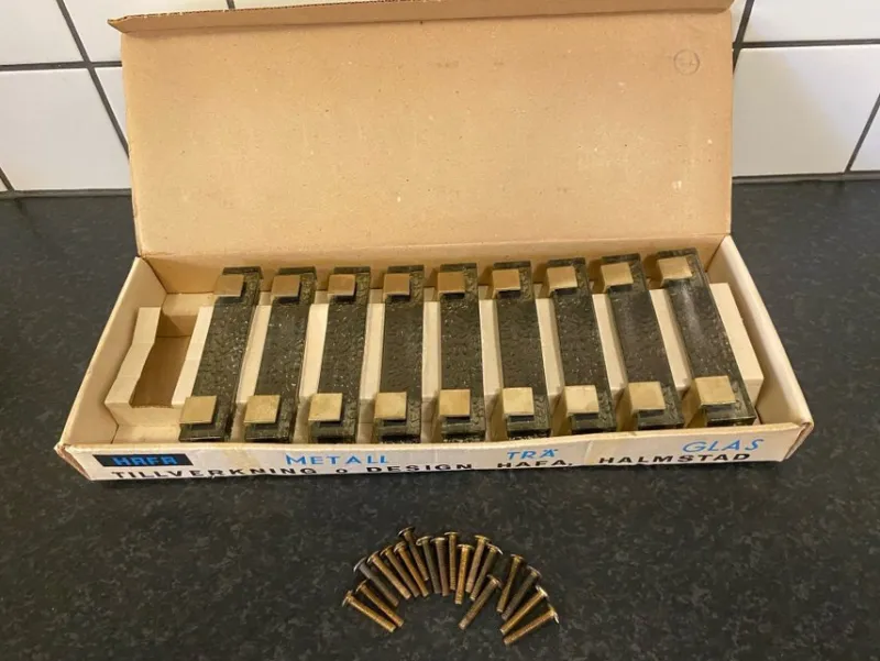 9 stycken snygga och i fint skick – original HAFA Maskot låd- och dörrhandtag i svagt olivgrönt färgat glas och mässing. Handtagen kommer i originalförpackning med 18 original skruvar. Längd ca 12 cm, höjd ca 2,8 cm och djup ca 3 cm. Ca mått enligt bild 9 är 8,6 cm. Väger ca 160 gram/ styck. Se mina bilder. Jag har låd- och dörrknoppar ur samma serie ute i en annan annons.