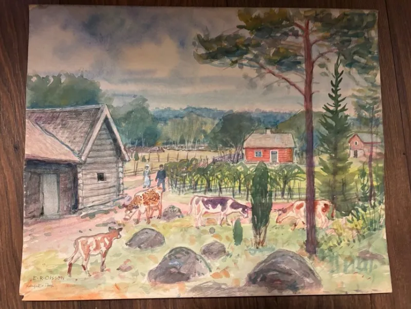 Tradera Akvarell, Tierp, Bondgård,av E.R. Olsson, Vintage, 35 kr^ Måleri
