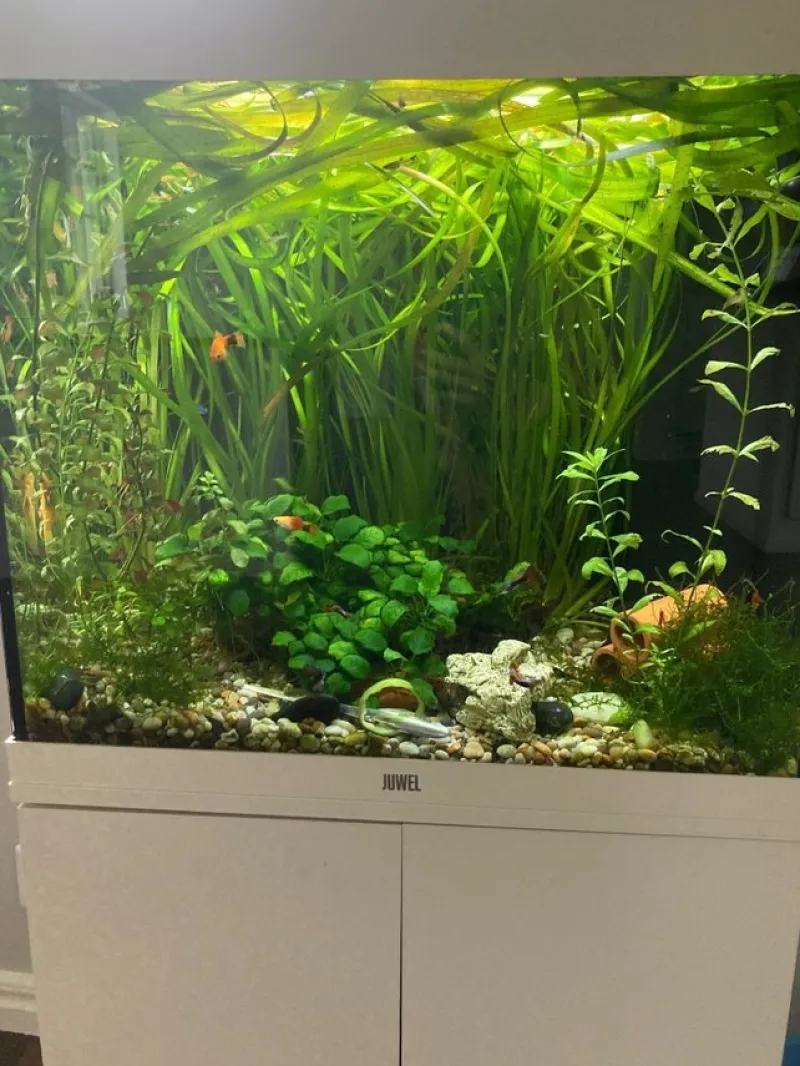 10 mindre skott av växten Vallisneria, höjd ca 10-20 cm. En väldigt tacksam växt som växer snabbt och förökar sig genom att skjuta ut stänglar i gruset/sanden. Jag använder ingen växtnäring och det är vanligt kranvatten i akvariet.
