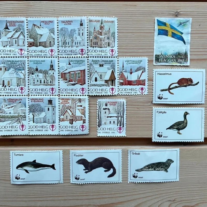 Äldre brevmärken (från 1982, 1983) med julhälsning – God helg – för att stödja forskningen, Hjärt- och Lungfonden samt brevmärken från WWF.