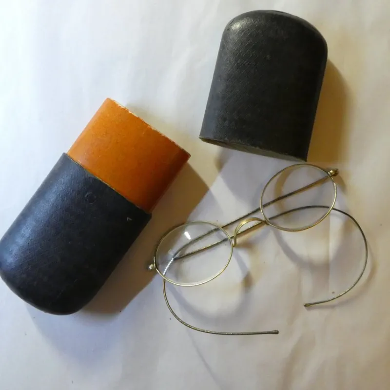 Ett par äldre glasögon med etui.