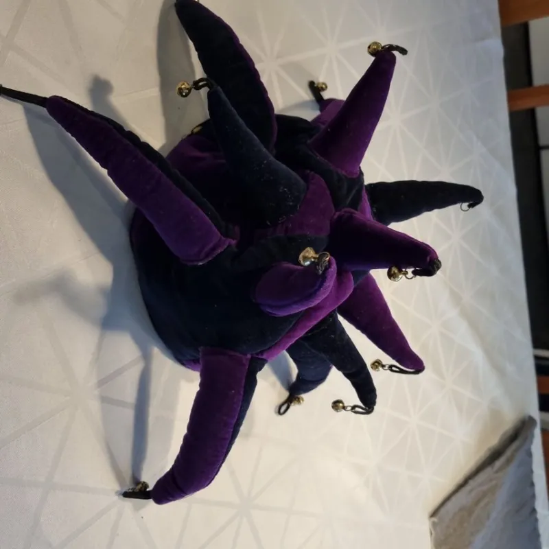 En unik jesterhatt i mörklila och svart sammet. Hatten är dekorerad med små guldfärgade klockor. Perfekt för maskerader, teater eller som en rolig accessoar.