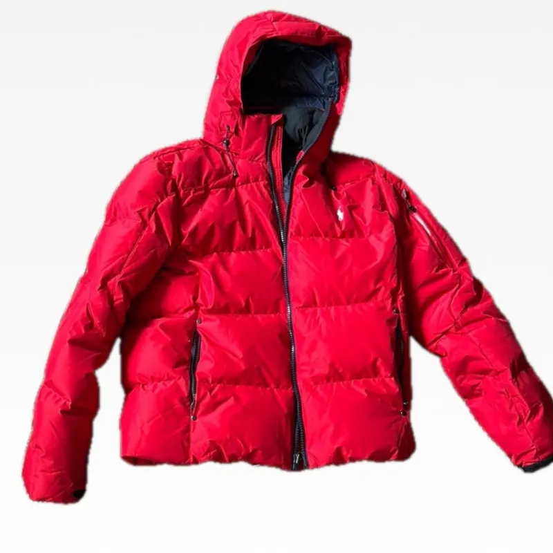 Snygg och varm dunjacka i röd färg. Jackan har en huva och flera fickor inkl. liftkortsficka på vänster ärm Perfekt för kalla vinter och skiddagar.