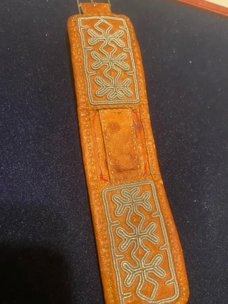 Unikt handgjort läderarmband för klocka med vackert broderi i silvertråd. Armbandet är tillverkat av brunt läder och har ett dekorativt mönster. Spännet är av metall. Armbandets längd är ca 23 cm och bredden ca 4 cm.