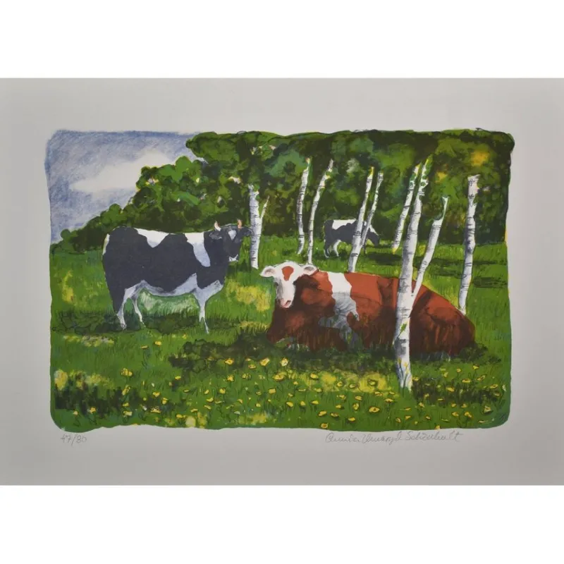Färglitografi av Annica Unnaryd Schönhult, signerad och numrerad 47/80. Motivets mått är 23 x 33 cm. Oramad (bladet större).