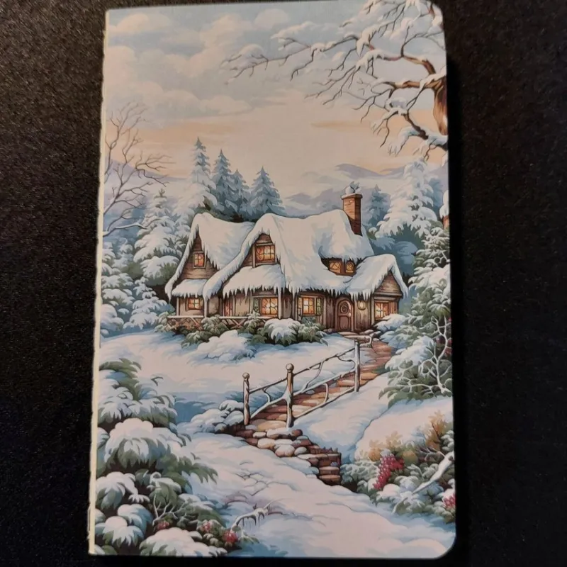 En liten linjerad anteckningsbok med mönster på framsidan.