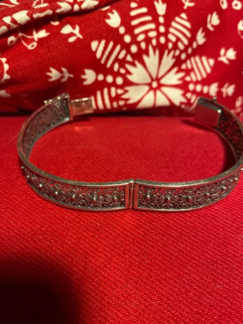 Äldre stelt vackert armband troligen silver i begagnat skick enligt bilder. Diameter 55-60 mm.