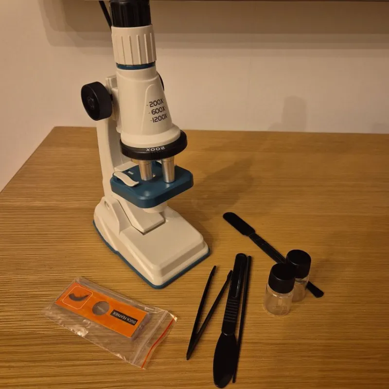 Mikroskop med LED-belysning, 200x, 600x, 1200x förstoring. Inkluderar tillbehör: 2 burkar, några glasplattor med biöder att kika på, 1 pincett, 1 spatel, 1 spatel med nål, 1 spatel med borste.