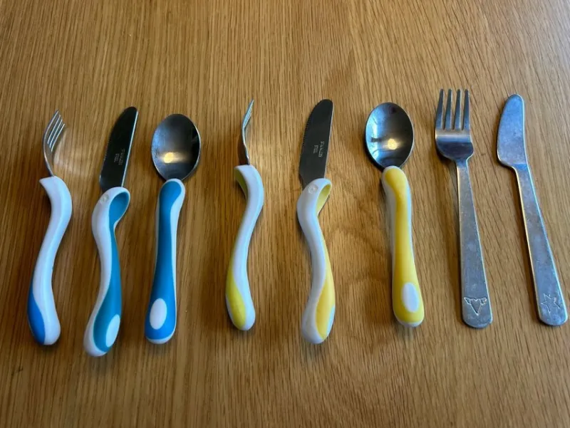 Säljer några ett set med barnbestick. Två det inkluderar gafflar, knivar och skedar med ergonomiska handtag i plast för lättare användning. Samt en gaffel och kniv. Besticken är tillverkade i rostfritt stål.