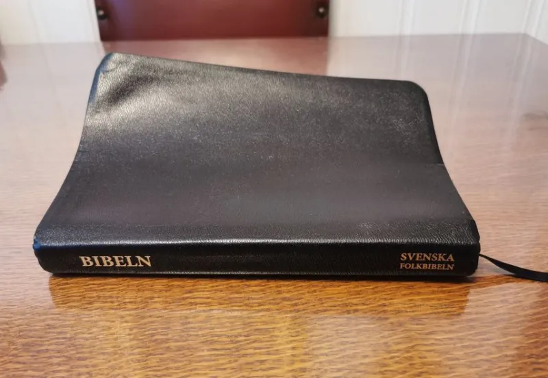 Svenska Folkbibeln i svart läderinbunden utgåva. Bilderna visar bokens skick.