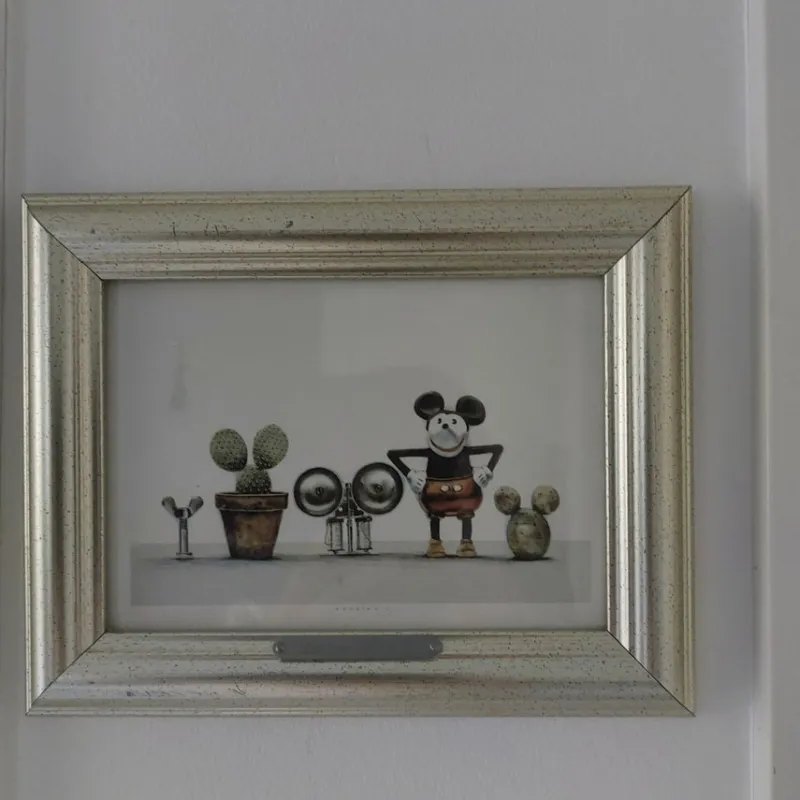 Bild med ett motiv av Musse Pigg och kaktusar. Bilden är inramad.