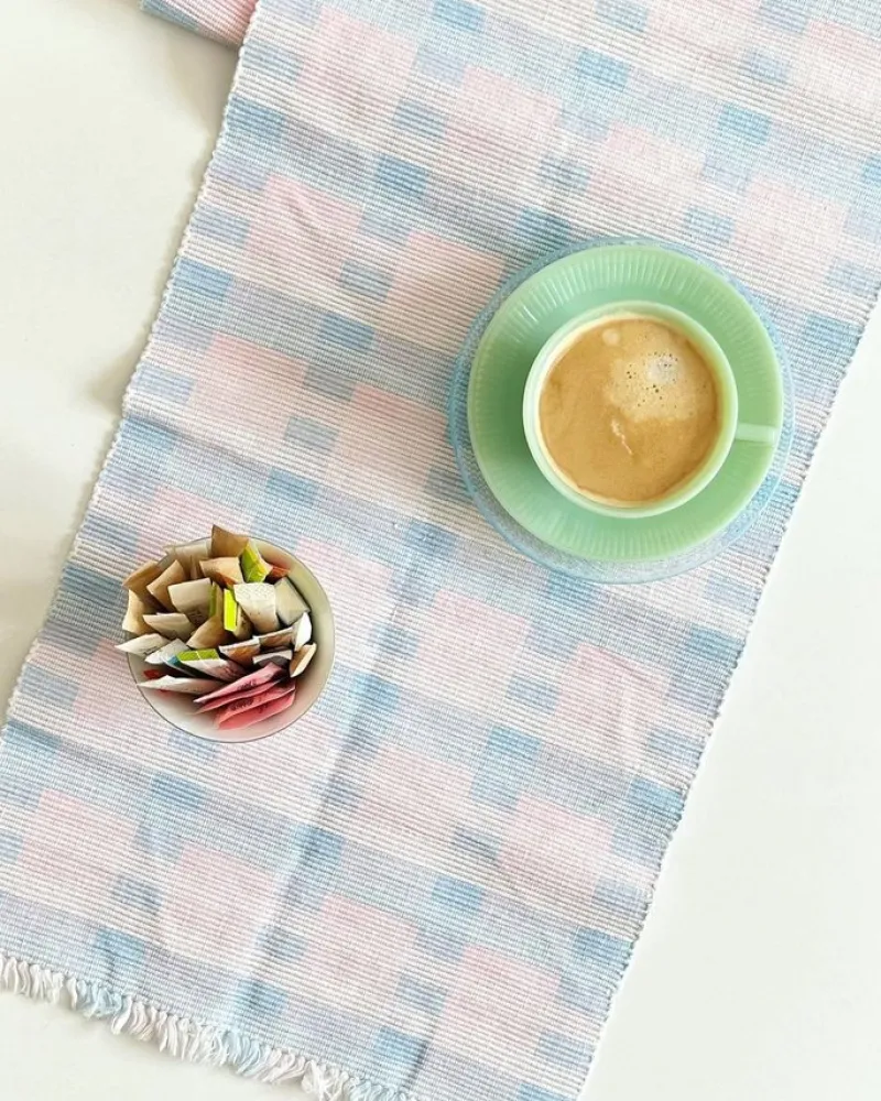 Svensk bordløber med sarte pasteller og frynser. Brug den på bordet eller kommoden – eller måske på væggen