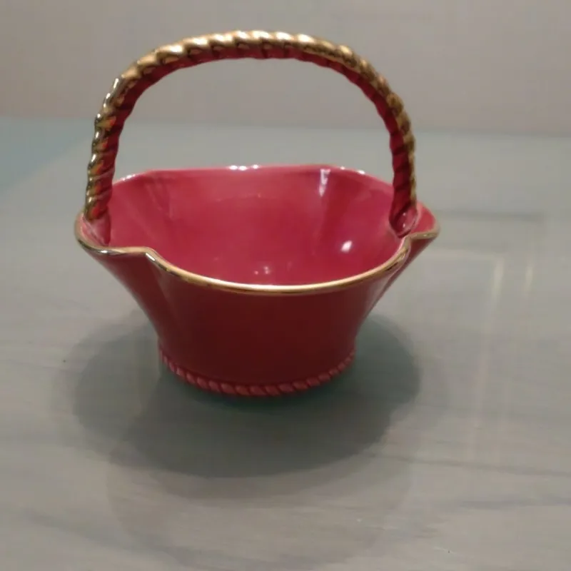 Keramik korg med handtag från Crown Devon. Korgens detaljer är i guld.