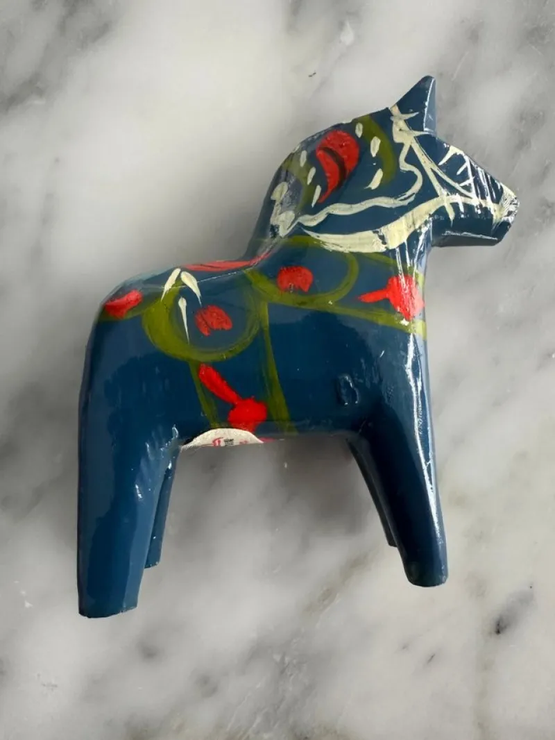 Handmålad Dalahäst från Nils Olsson i Nusnäs. Märkt på undersidan. En vacker och traditionell Dalahäst i blått med röda och gröna detaljer.