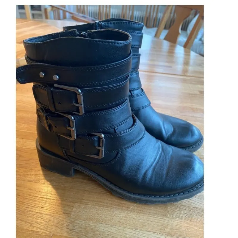 Snygga svarta stövlar med spännen. Stövlarna har dragkedja på sidan.