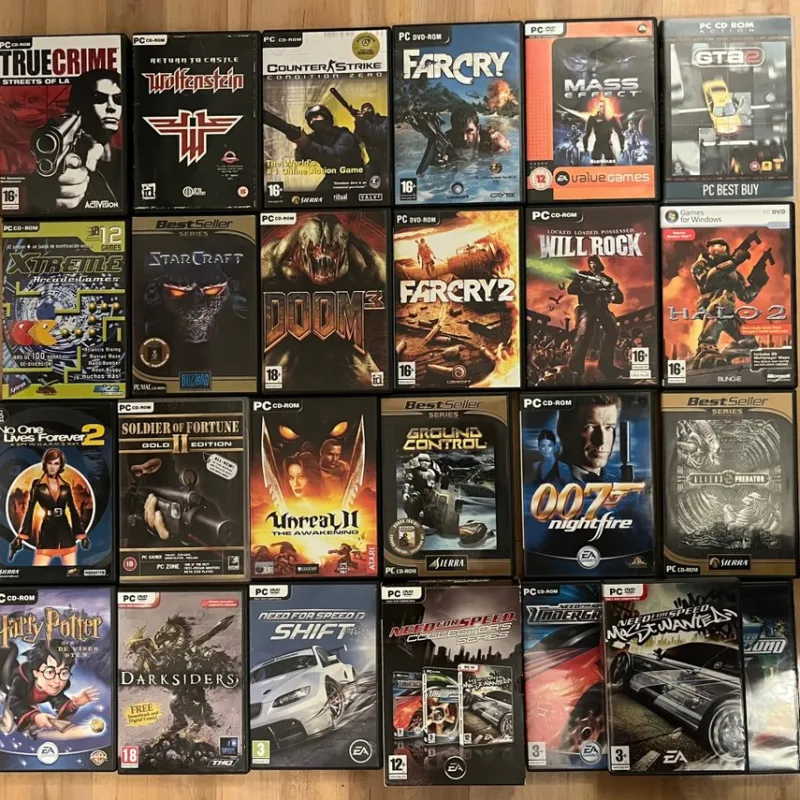 GTA2!! Unreal 2! James Bond 007! Wolfenstein! Halo 2! Harry Potter! Need for Speed collection! Soldier of Fortune 2 – Gold edition! Doom 3! Darksiders! True Crime! Counterstrike! Mm!