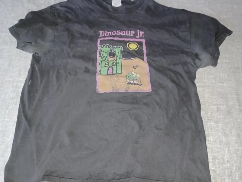 Välanvänd och urtvättad (den är nog mer mörkgrå än svart nuförtiden). Uttänjd på bredden, så fuktig t-shirt+utsträckning kan nog vara bra att upprepa några gånger. Har rejäla hål i armhålorna och ett vid halsöppningen. Kan vara en tröja att arbeta med lite och återställa så gott som det går. Eller göra nå't annat med den. Lite "deodorant ljus" i armhålorna också.