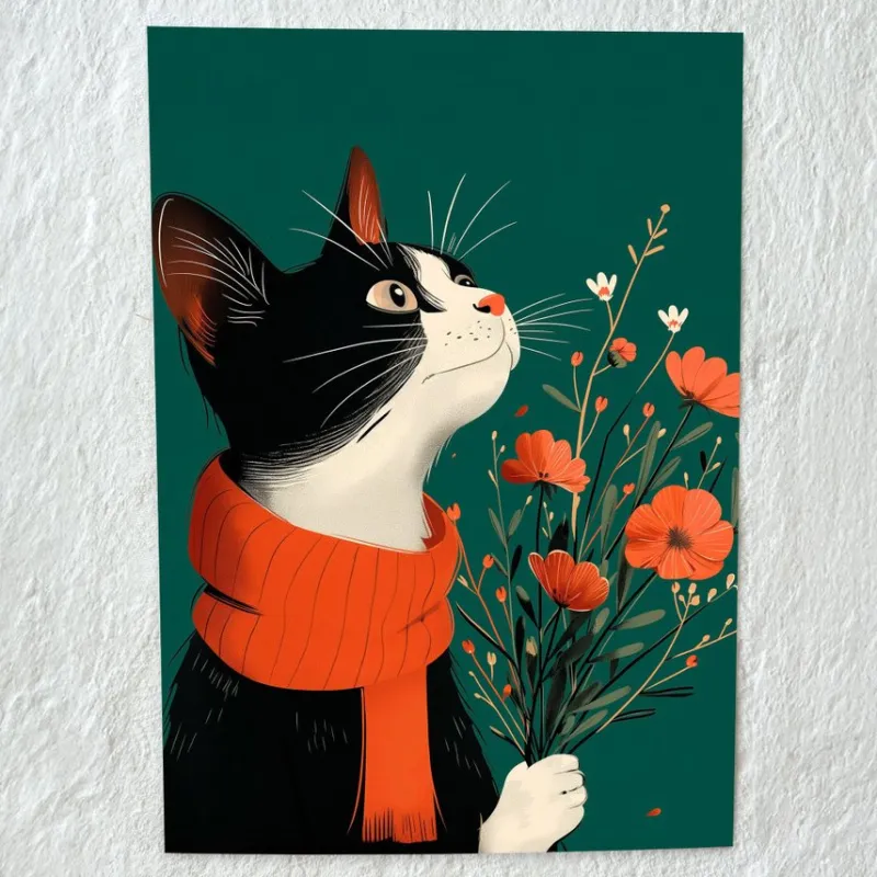 • Tryck av hög kvalitet: En charmig och stilfull illustration av en svartvit katt i en röd halsduk, omgiven av vackra blommor, fångad i en uttrycksfull och tidlös pose.