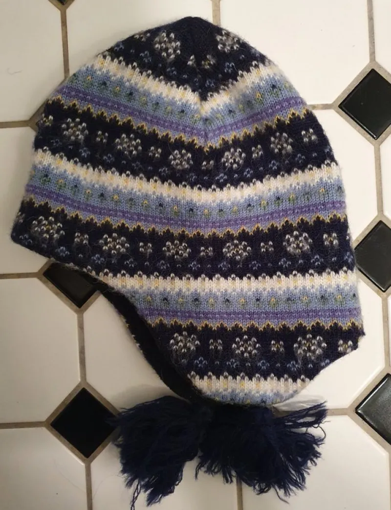 100% ull med fodrad så den inte kliar över panna, nacke och öron. Namnad.