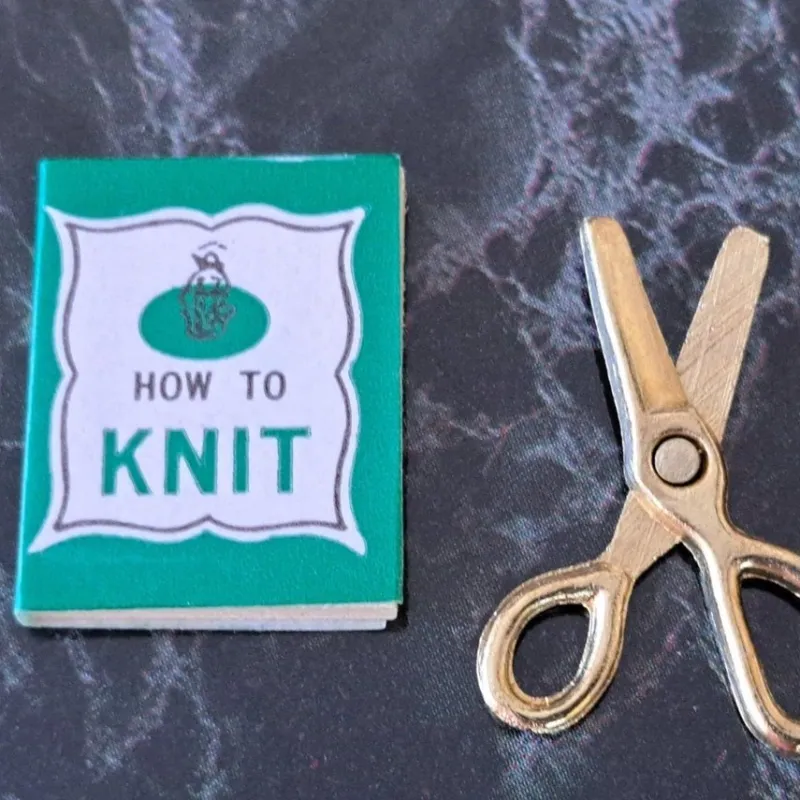 En liten instruktionsbok med titeln "How to knit" – replik, ej öppningsbar – och en guldfärgad sax. Inte heller dess skänklar går att öppna, men den är mycket fint gjord. Bokens bredd 1,9 cm.