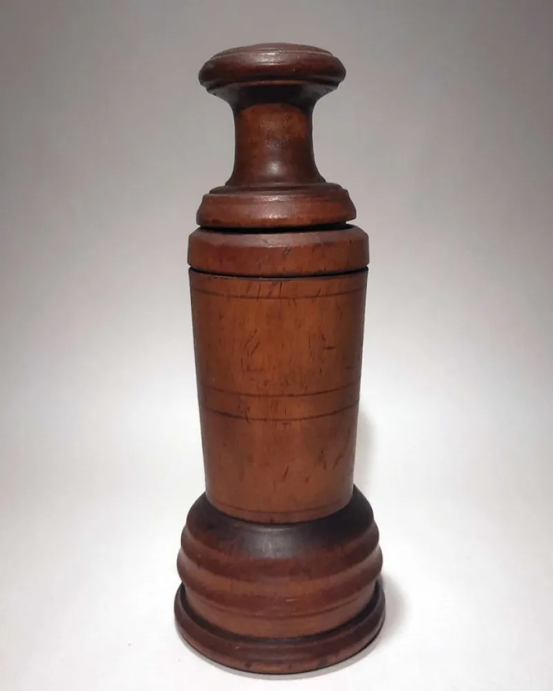 En så fin gammal antik kryddkvarn från 1800-talet som är svarvad i trä samt skodd med järn för att riva eller mala kryddorna som sedan samlas upp i den nedre behållaren se bilder.