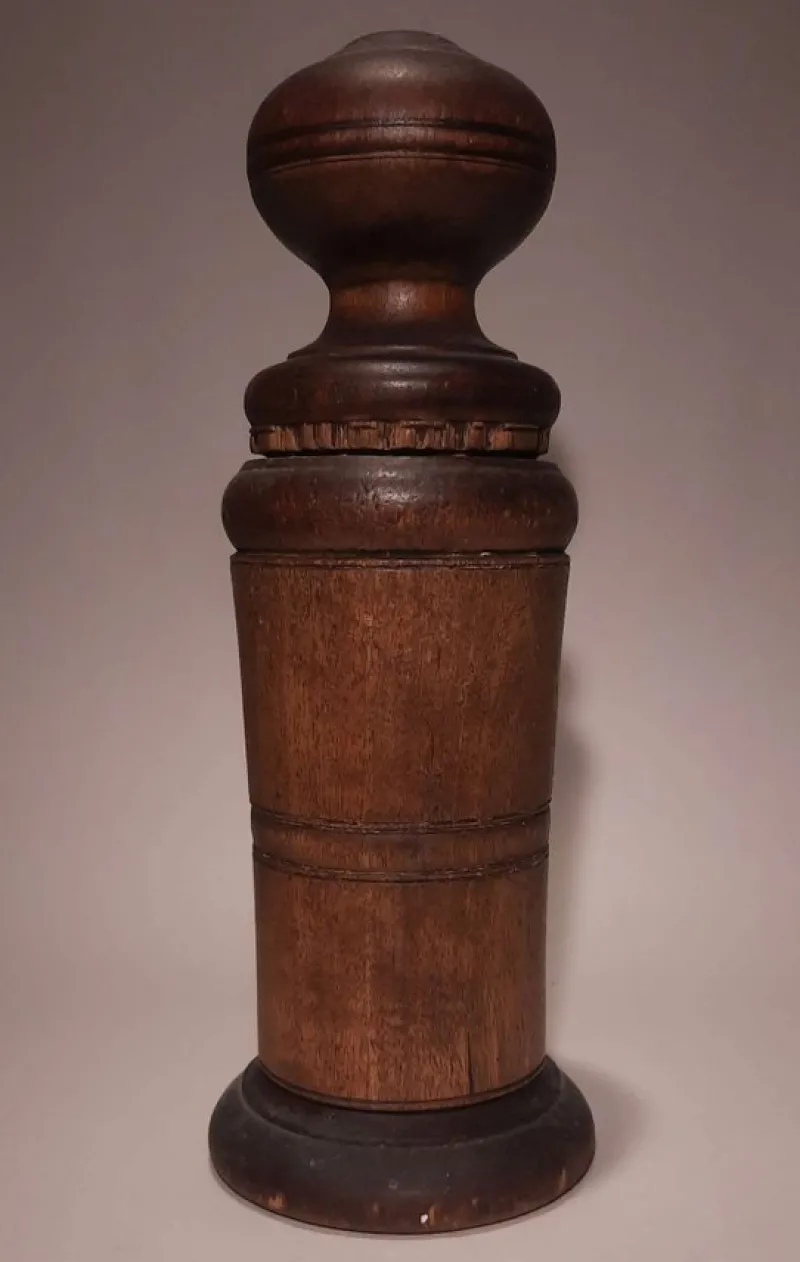 En så fin gammal antik kryddkvarn från 1800-talet som är svarvad i trä samt inlagt med järn för att riva eller mala kryddorna se bilder.