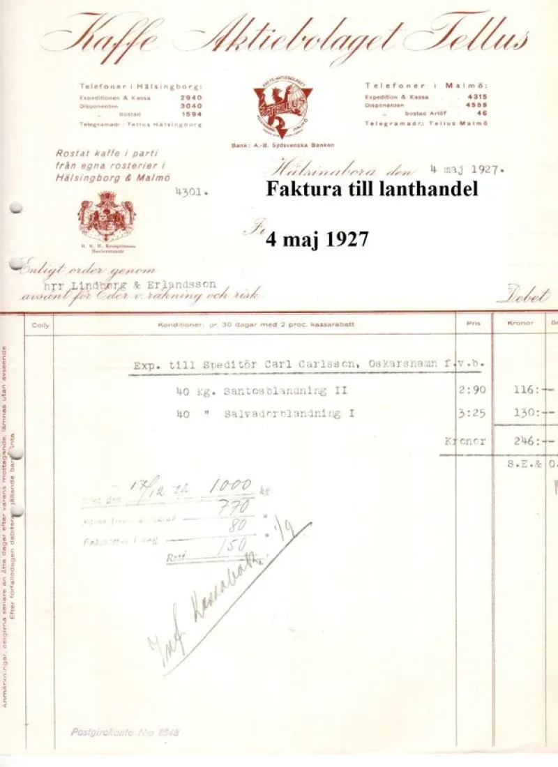 Tradera Faktura från Tellus Kaffe Helsingborg 4 maj 1927 från nedlagd lanthandels lager^ Fraktsedlar & Fakturor