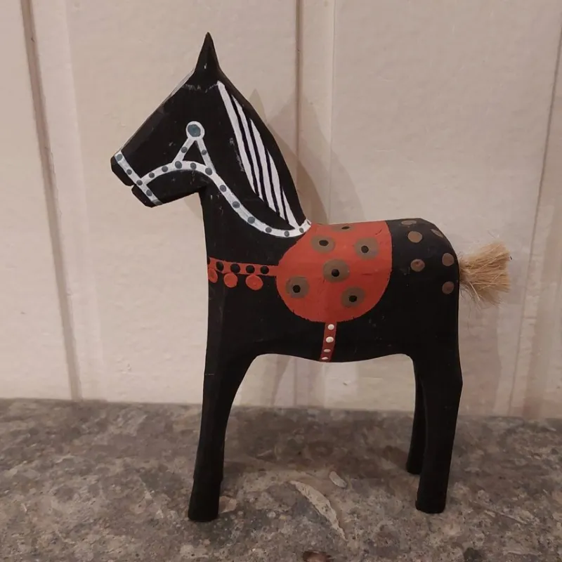 Handgjord Faluhäst i trä, 14,5 cm hög. Signerad o numrerad (342). Tillverkad av Kent Olander (Folk o Fä i Trä). Inga skador.