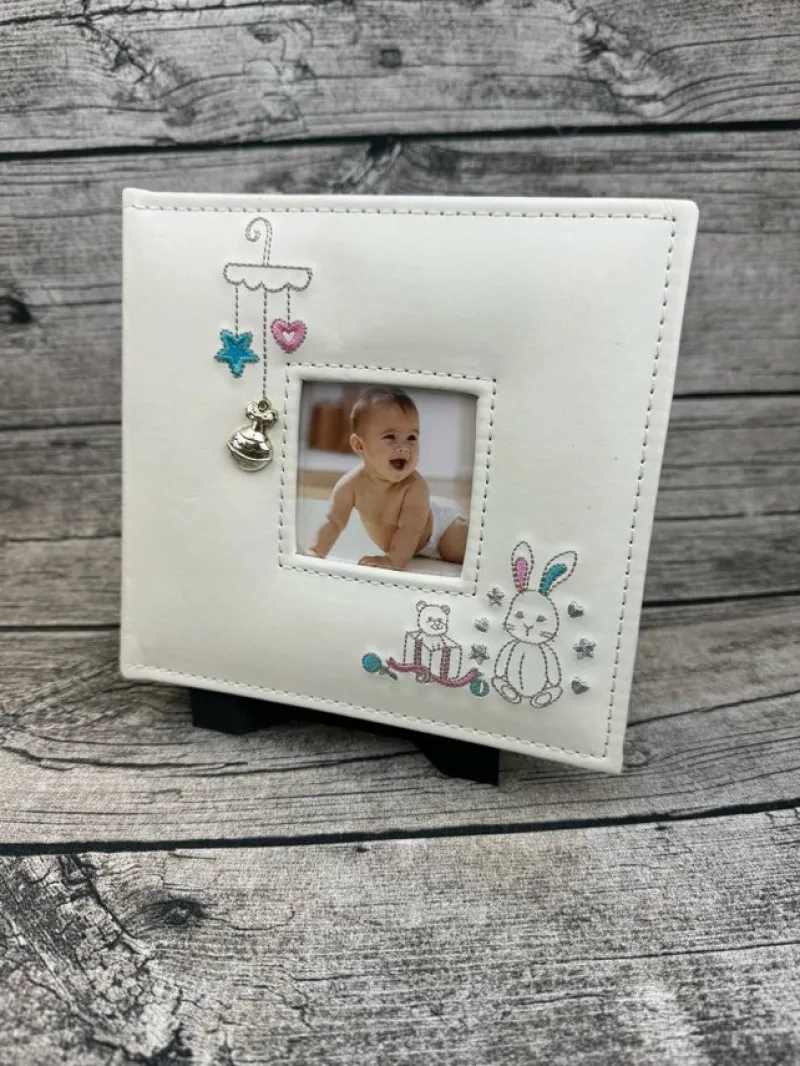 Sött fotoalbum för barn med fina detaljer. Perfekt för att samla minnen från barnets första år.