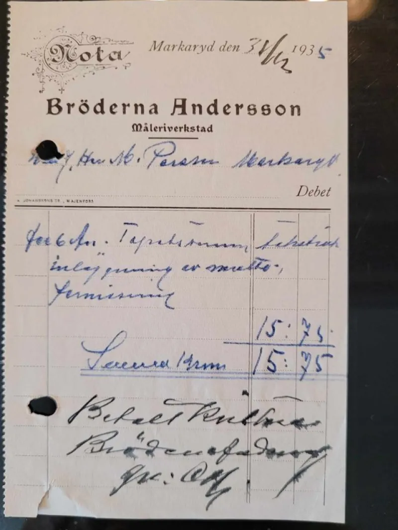 Tradera Fraktsedlar & Fakturor<Nota Bröderna Andersson Måleriverkstad Markaryd Småland
