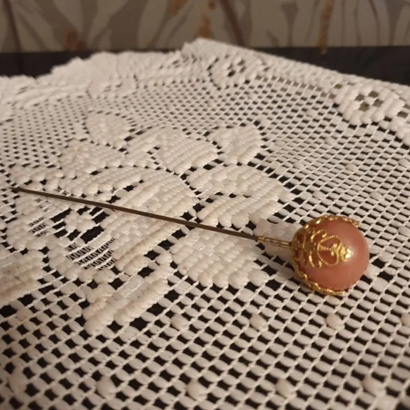 Gammal hattnål vet tyvärr inte vad det är för material . Stenen är antagligen en rosa korall Cabochon