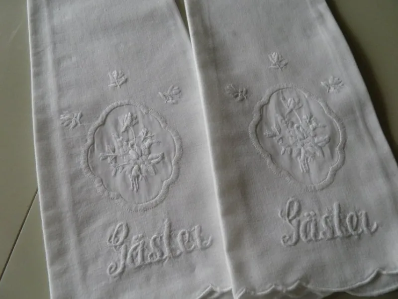 Två vita gästhanddukar med maskinbroderi. Mått 32×52 cm.