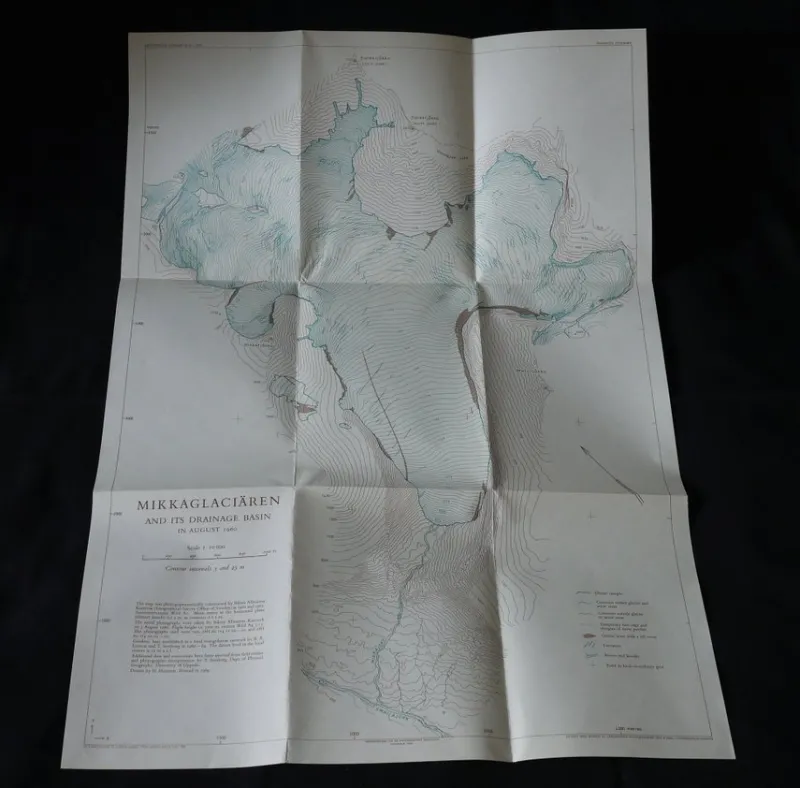 Glaciärkarta i skala 1:10 000 över Mikkaglaciären i Sarek. Tryckt 1969. Ca 49×71 cm. Fint skick. Inget skrivet på den, inga veck eller fläckar. Fyra nålsticksstora hål i vikningsmöten, en två cm lång reva i nederkanten.