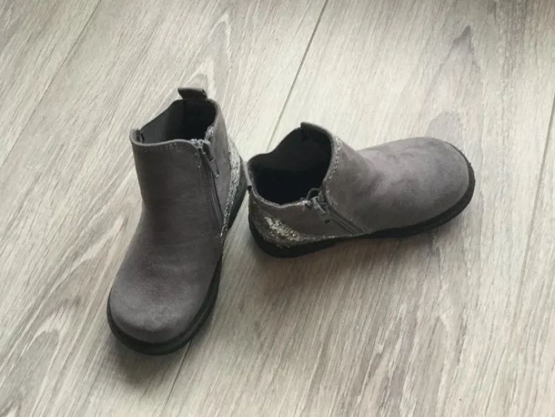 Grå känga, "moccaliknande material" strl 22, innermått ca 139 mm, Luca & Lola, ej fodrade, dragkedja i sidan.