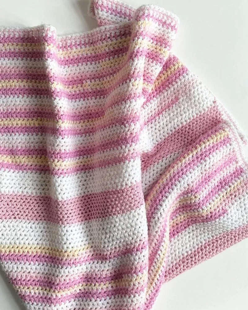 Skønt, håndhæklet barnevognstæppe i rosa/hvide/gule toner