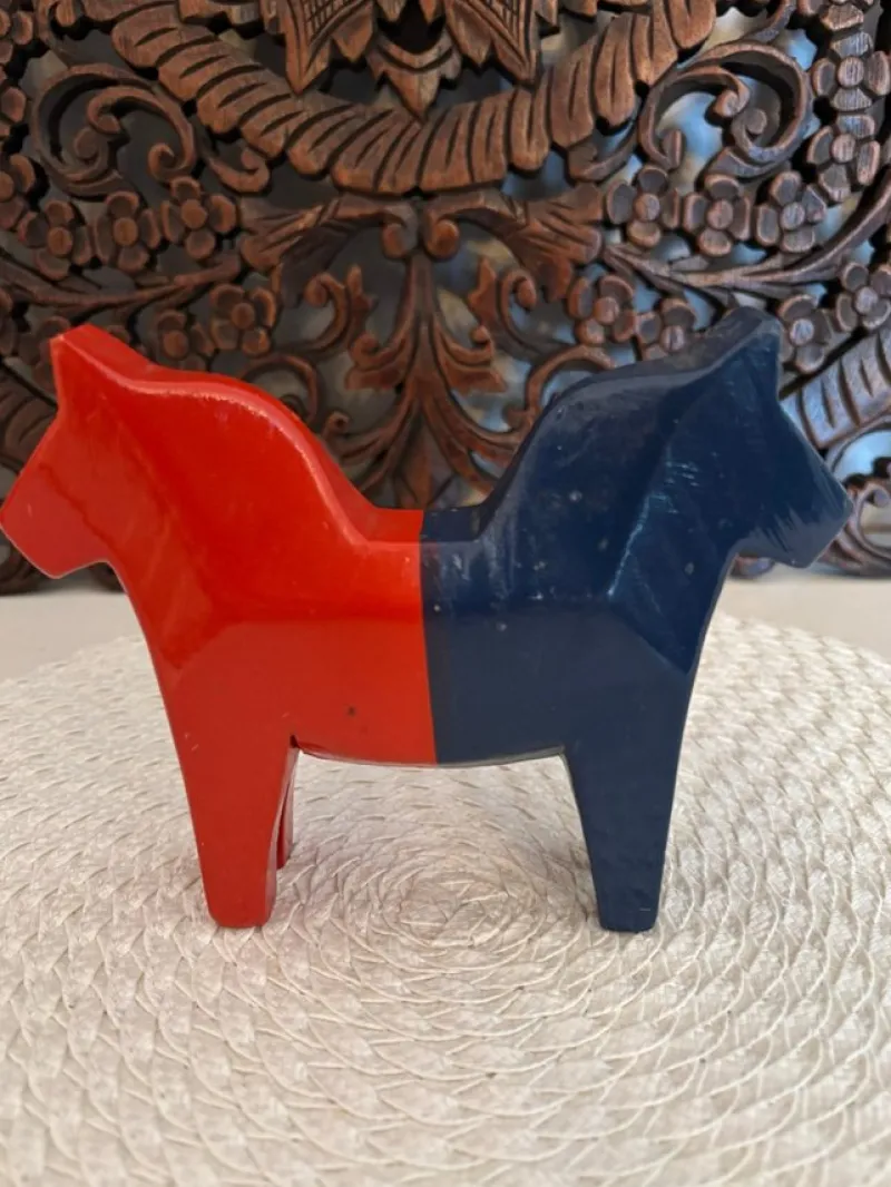 Tradera Halv röd, halv blå Dalahäst från Nils Olsson i Nusnäs^ Dalahästar