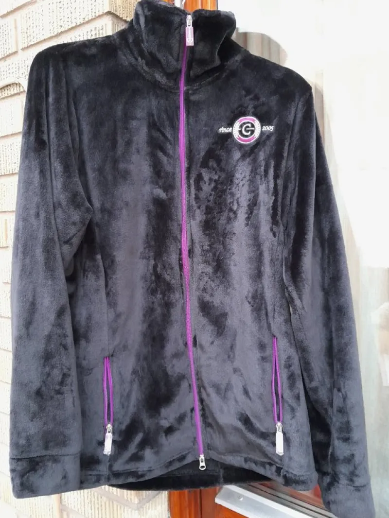 Snygg och mjuk svart fleecejacka med lila tvåvägs-dragkedja Jackan har en hög krage och två fickor, med dragkedja. Det finns en liten brodyr på bröstet och en på baksidan av kragen.