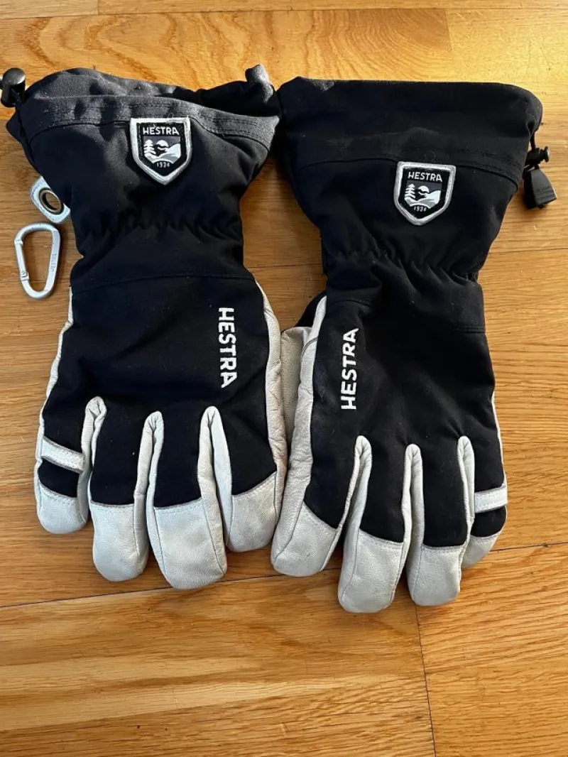 Hestra skidhandskar, storlek 9. De har kardborreknäppning och snörning vid handleden samt en karbinhake för enkel förvaring.