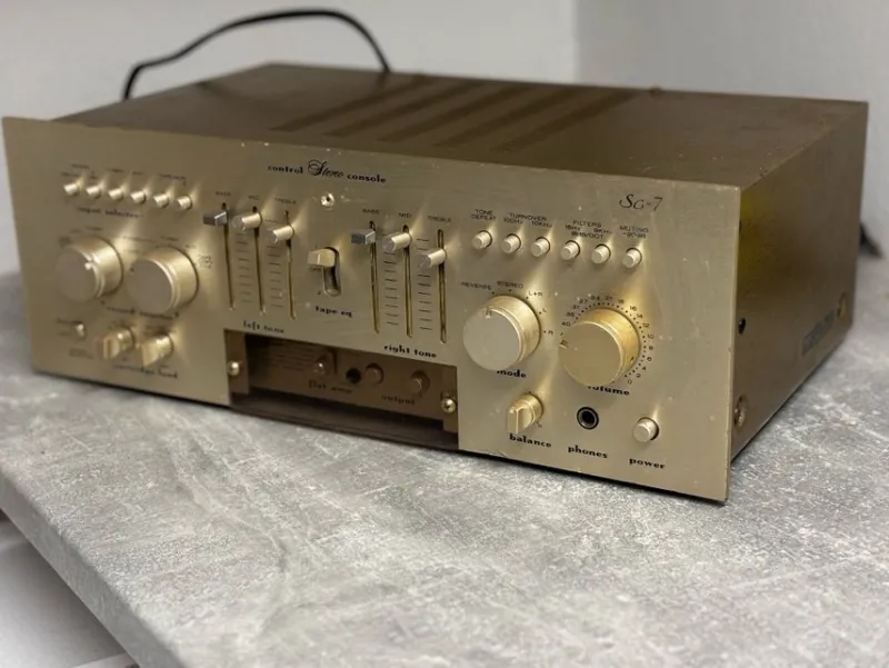 Marantz SG-7 stereoreceiver. Enhet med många anslutningsmöjligheter och funktioner, inklusive flera ingångar för olika ljudkällor, tonkontroller, balans och volymkontroll. Perfekt för den audiofile som söker en vintageförstärkare med klassisk design.