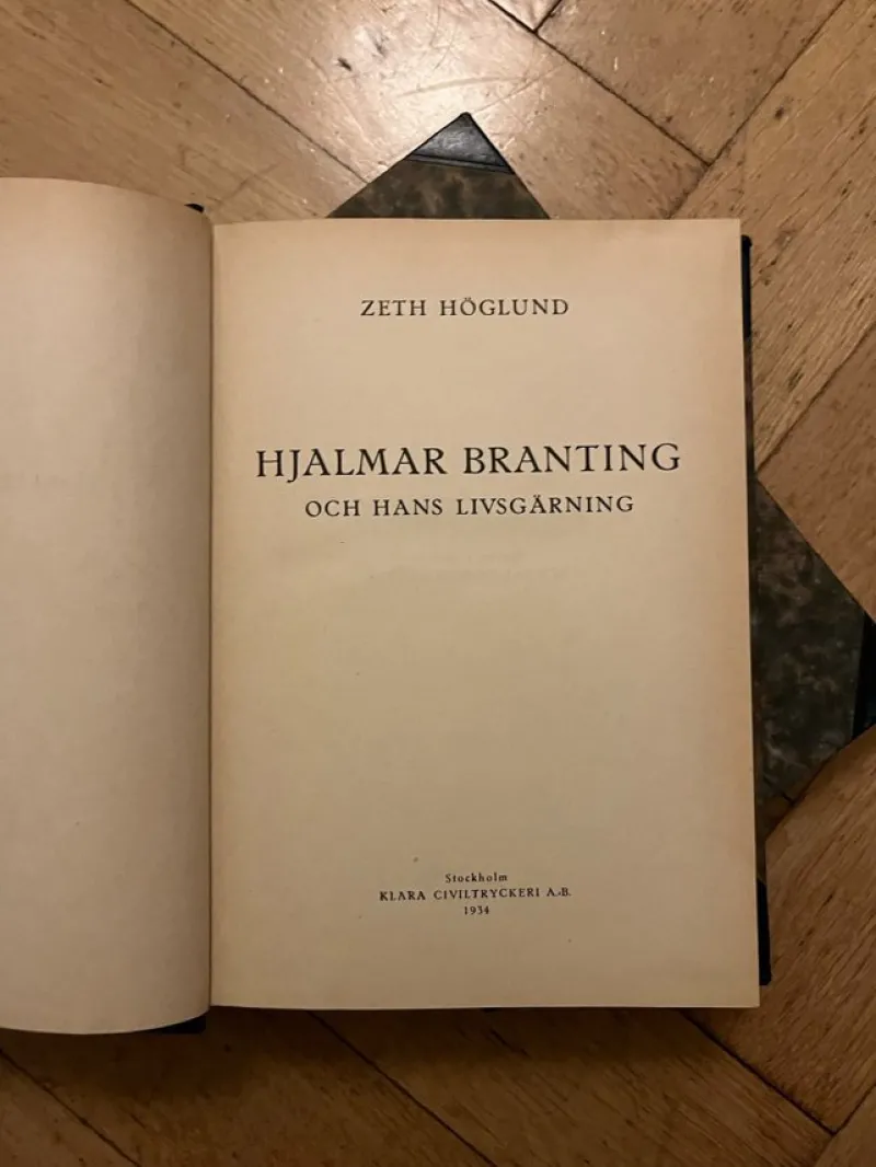 Två volymer av Zeth Höglunds biografi om Hjalmar Branting. Boken är i gott skick med några tecken på användning.