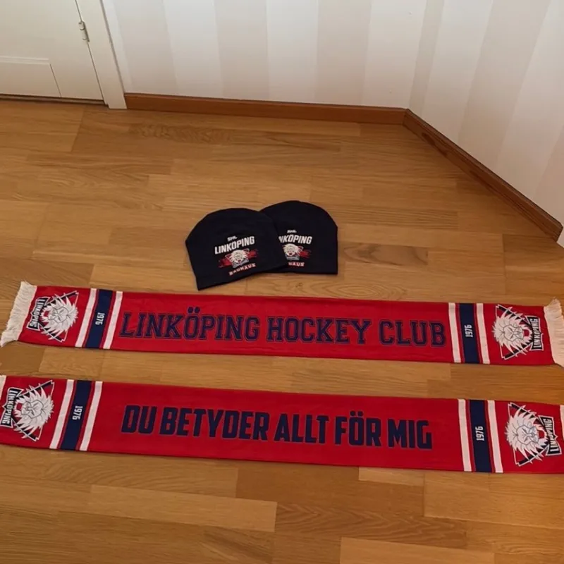 Säljer två stycken mössor och två stycken halsdukar från Linköping Hockey Club. Mössorna är mörkblå med LHC-logga och Bauhaus-sponsor. Halsdukarna är röda med LHC-logga och texten "Du betyder allt för mig".