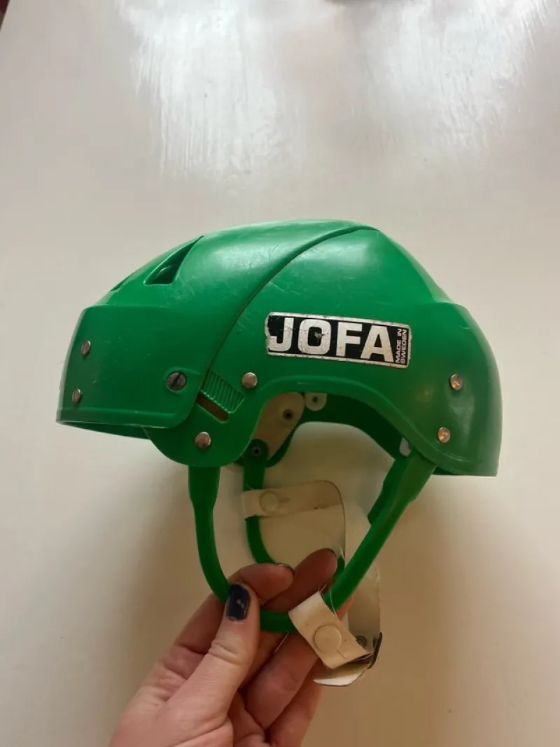 Grön JOFA skridsko / hockey -hjälm. Hjälmen är märkt med "VM". Tillverkad i Malung, Sverige. Patenterad modell. Inkluderar original remmar.